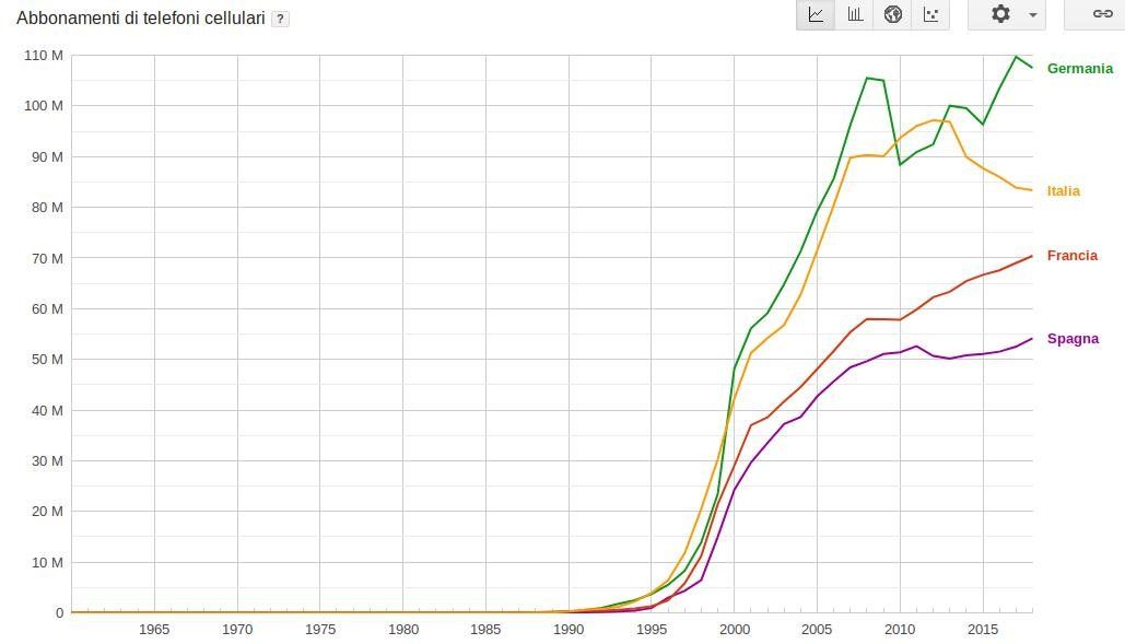 In quanto a cellulari, come vedete, siamo stati anche primi in termini assoluti intorno al 2010, nonostante la Germania abbia quasi 84 milioni di abitanti. Scemi si, ma connessi in maniera atroce.